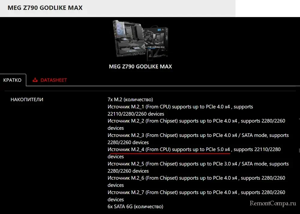 На данный момент что на платформе Intel, что на платформе AMD поддержка SSD PCI-E 5.0 реализована только за счёт процессорных линий PCI-E 5.0. Даже последние на дату написания статьи 700-я серия Intel и 600-я серия чипсетов AMD не предусматривают чипсетных линий PCI-E 5.0. Для работы SSD PCI-E 5.0 на максимальных скоростях компьютер должен быть с материнской платой на базе чипсета Intel 700-й или 600-й серии, либо же на базе чипсета 600-й серии AMD. На плате должен быть слот M.2, работающий за счёт процессорных линий PCI-E 5.0. И, соответственно, процессор должен быть с поддержкой PCI-E 5.0, а это на данный момент не все, а лишь отдельные процессоры Intel начиная с 12-го поколения. И также не все, а лишь отдельные процессоры Ryzen 7000.