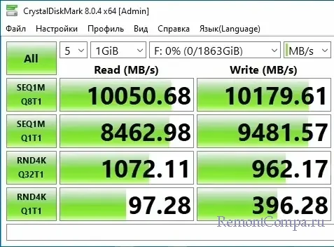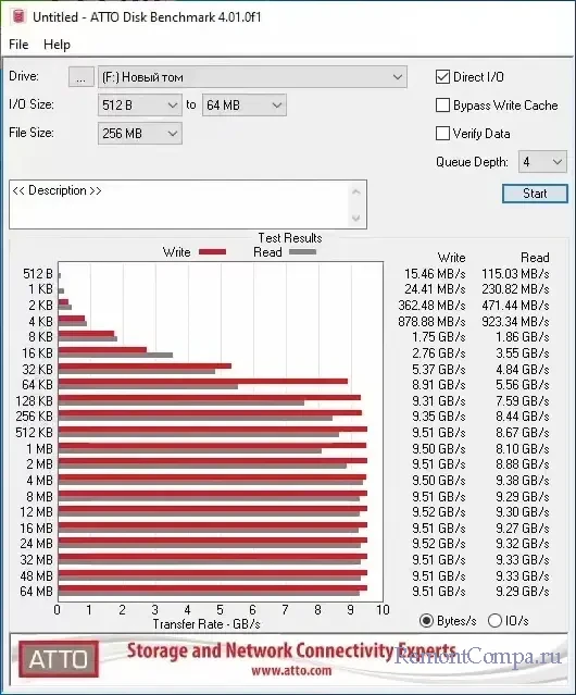 Синтетические тесты утилитой ATTO Disk Benchmark дают нам детализацию, с какими максимальными скоростями накопитель может читать и записывать разный размер данных – от малейших 512 б до 64 Мб, где уже может развиться скорость. И развиться в случае с тестируемым SSD она может до 9 тыс. Мб/с с лишним, что лишь немного не дотягивает до максимальных возможностей накопителя в принципе.