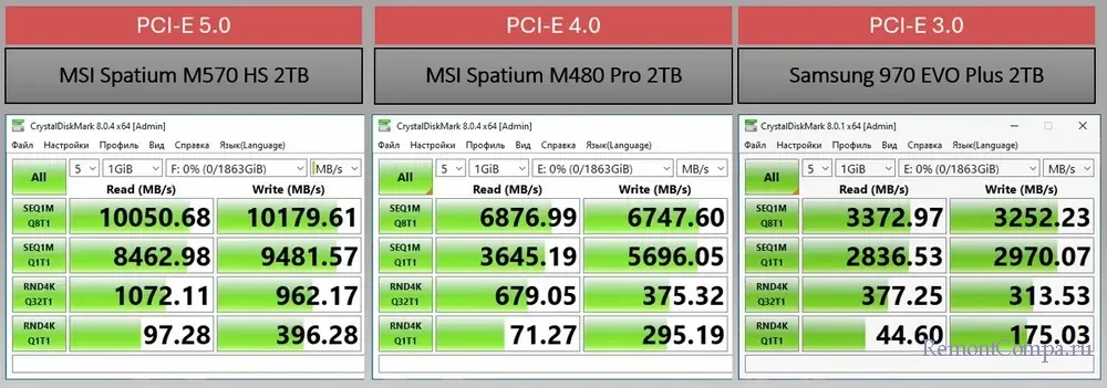 Всё должно познаваться в сравнении, потому, друзья, давайте сравним полно раскрывающие возможности накопителей синтетические тесты в CrystalDiskMark разных устройств разных поколений PCI-E 5.0. Представителю PCI-E 5.0 MSI Spatium M570 HS 2TB противопоставим его же собрата с предшествующей версией PCI-E 4.0 - MSI Spatium M480 Pro 2TB с тем же объёмом 2 Тб. И им обоим противопоставим одного из лучших представителей SSD с версией PCI-E 3.0 - Samsung 970 EVO Plus 2TB, также с объёмом 2 Тб. Это будет наглядная эволюция SSD PCI-E от версии 3.0 до версии 5.0. Обратим внимание, что прогресс наблюдается не только в тестах последовательных скоростей, что связано с пропускной способностью PCI-E 5.0, но также в тестах рандомных скоростей мелких файлов, что, очевидно, связано с применением в более новых накопителях более современных контроллеров и технологий. Хотя здесь нужно учитывать, что накопитель накопителю – рознь.