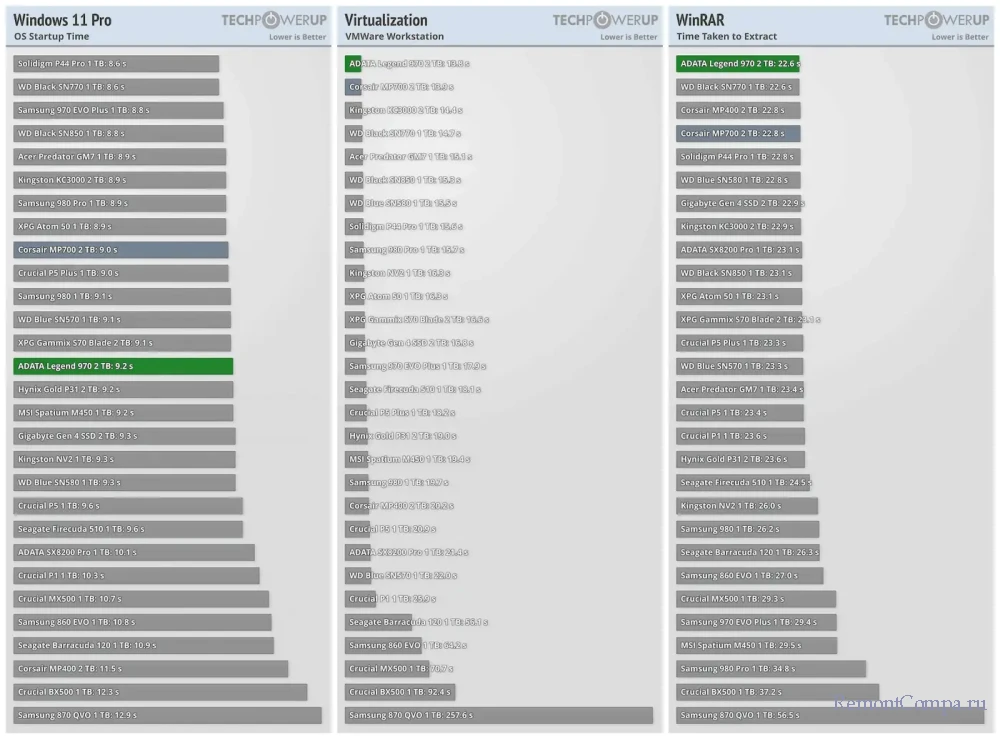 Больше о накопителях PCI-E 5.0 нам расскажут тесты сервиса TechPowerUp. Возьмём, к примеру, один из протестированных им SSD PCI-E 5.0 - Adata Legend 970 2TB. Это примерно такой же, что и рассмотренный выше MSI Spatium M570 HS 2TB: Adata Legend 970 2TB – это накопитель с объёмом 2 Тб, его заявленные производителем максимальные скорости чтения и записи данных – 10 тыс. Мб/с, но стоит он в DNS дороже - 35 тыс. руб. Из всех тестов накопителя отметим характеризующие его возможности в обычных пользовательских задачах на фоне разных накопителей с PCI-E 4.0 и 3.0. Так, SSD PCI-E 5.0 лидирует в операциях виртуализации VMware Workstation и распаковки архивов WinRAR. Но он не в числе лучших в операции по загрузке Windows 11.