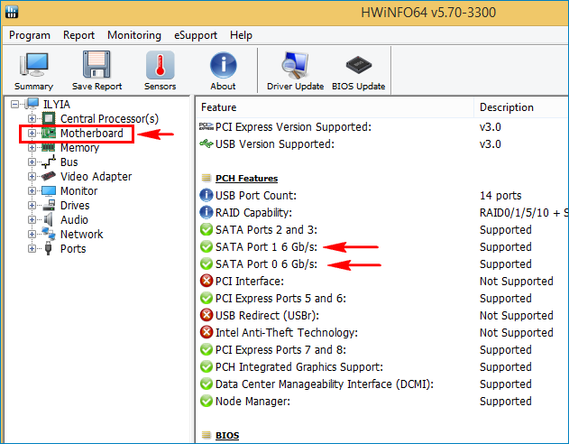 В программе HWINFO нажмите Motherboard и смотрите интерфейс SATA. В моём случае материнка поддерживает интерфейс SATA III (6 Гбит/с).