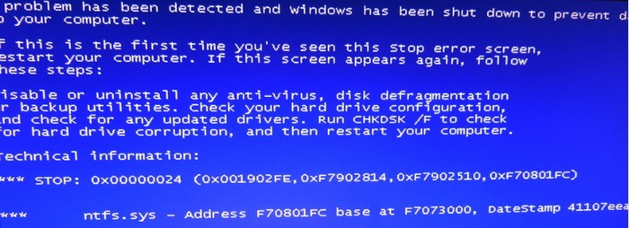 Насчёт синего экрана смерти и ошибки 0x00000024, то я бы посоветовал удалить все разделы с жёсткого диска и повторить установку системы.