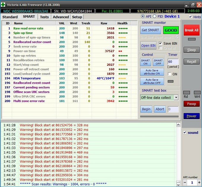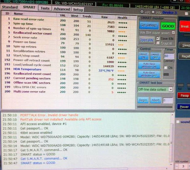 По описанию вроде бы все понятно, а вот на практике все иначе. 5 дисков проверил, у которых какие-то проблемы. У всех пробег часов от 13000 до 37000 часов. У всех показывает статус в «S.M.A.R.T. Status: Good», а вот линейная проверка в dos показывает много ошибок. Пробовал через разные разъемы, а также заменять sata каель. Результаты практически одинаковы...