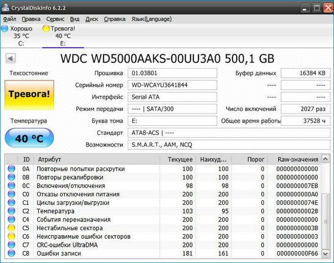 Как видите, CrystalDiskInfo прямо указывает нам (подтверждая опасения "Виктории"), на жёстком диске WDC WD5000AAKS-00A7B2 (объём 500 ГБ) нехорошие значения атрибутов отвечающих за Переназначенные сектора, Нестабильные сектора, Неисправимые ошибки секторов, подсвечивая их жёлтым цветом и указывает на тех. состояние жёсткого диска одним словом "Тревога"