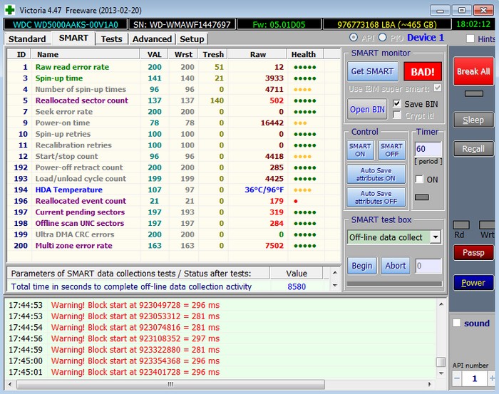 Простыми словами, если микропрограмма, встроенная в жёсткий диск, обнаружит сбойный сектор (бэд-блок), то она переназначит этот сектор сектором с резервной дорожки (процесс называется remapping). Но резервных секторов на жёстком диске не бесконечное число и программа нас предупреждает, что скоро бэд-блоки переназначать будет нечем, а это чревато потерей данных и нам надо готовиться менять жёсткий диск на новый. Забегая вперёд, скажу, что в следующей статье мы попробуем подлечить этот жёсткий диск.