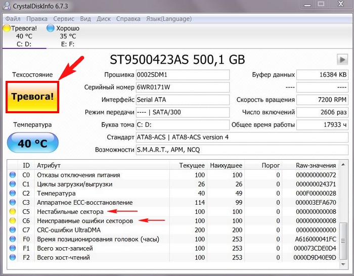 Как видите, CrystalDiskInfo прямо указывает нам (подтверждая опасения "Виктории"), на жёстком диске WDC WD5000AAKS-00A7B2 (объём 500 ГБ) нехорошие значения атрибутов отвечающих за Переназначенные сектора, Нестабильные сектора, Неисправимые ошибки секторов, подсвечивая их жёлтым цветом и указывает на тех. состояние жёсткого диска одним словом "Тревога"