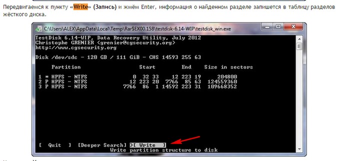 Итак почти финиш, нужный для восстановления раздел мы уже выбрали, здесь выбираем с помощью стрелок на клавиатуре «Write» (Запись) и вся информация о найденном разделе будет записана в таблицу разделов жёсткого диска, нажимаем Enter.