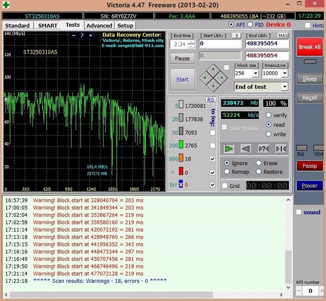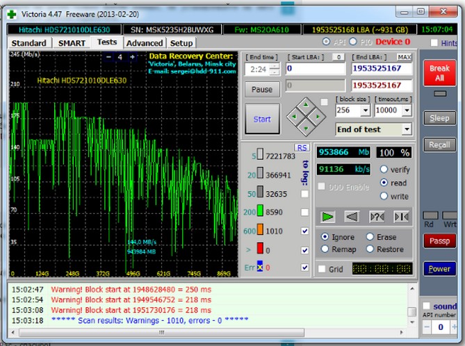 В правой части окна программы отметьте пункт Ignor и пункт read, затем нажмите Start. Запустится простой тест поверхности жёсткого диска без исправления ошибок. Этот тест не принесёт никаких плохих или хороших воздействий на Ваш винчестер, но когда тест закончится, мы узнаем в каком состоянии находится наш жёсткий диск.