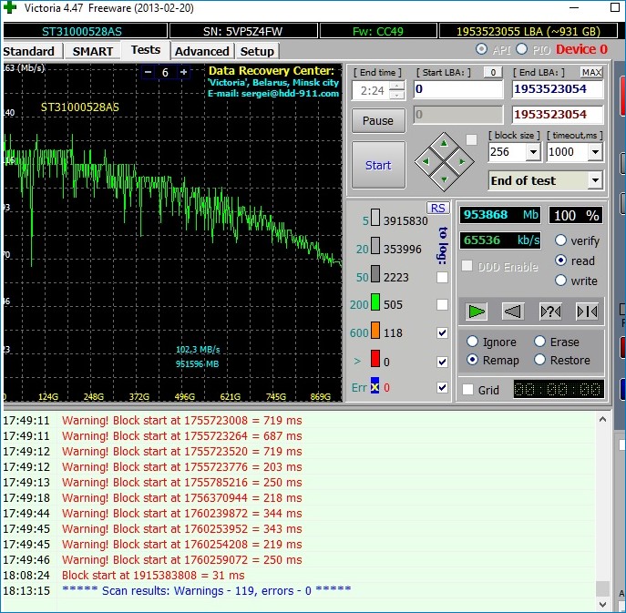 Решил воспользоваться Викторией, пройтись по бэдам, но или программа некорректно работает или еще в чем причина, не знаю. Суть: в режиме "ignore..." находит 92 bad-блока. Запускаю режим Advanced Remap, находит и исправляет ~ 5-10 блоков, а затем на бешеной скорости прогоняет остаток проверки до конца. Запускаю снова в режиме "ignore" и опять те же 92 bad-блока. И так несколько раз в разных режимах чтения (линейное, батерфляй, случайное). В чем может быть проблема?