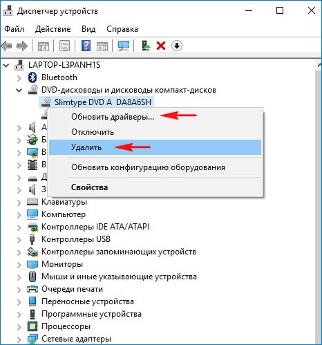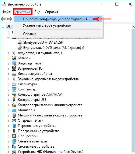 Также можно попробовать "DVD-дисководы" --> "Обновить конфигурацию оборудования".