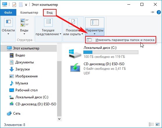 Этот компьютер -> Вид -> Парметры -> Изменить параметры папок и поиска