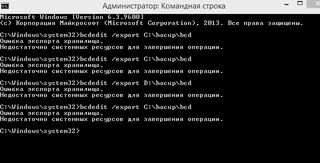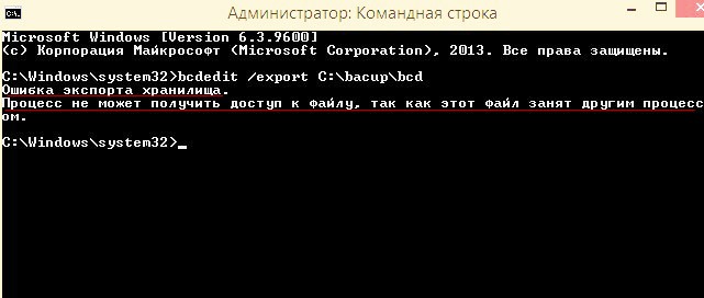 Попробуйте перезагрузиться и повторить команду bcdedit /export C:\bacup\bcd.