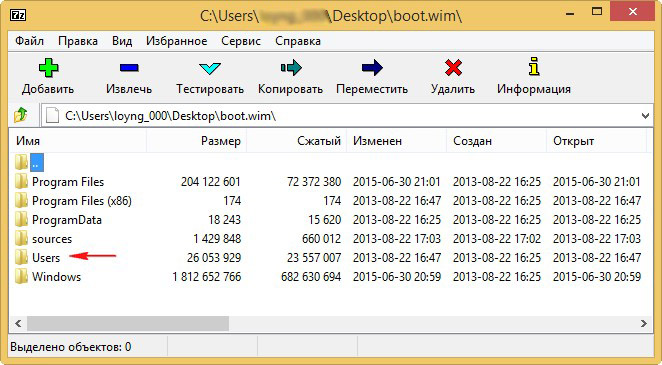 Если открыть файл boot.wim в русскоязычной Windows 8.1, в программе 7zFM, то там есть такие папки, в том числе папка Users: