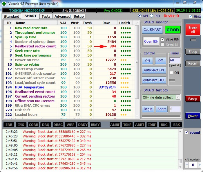 В викторией под виндоус определил адреса сбойных секторов - 7 бэдов и 17 шт с задержкой 600 мс.