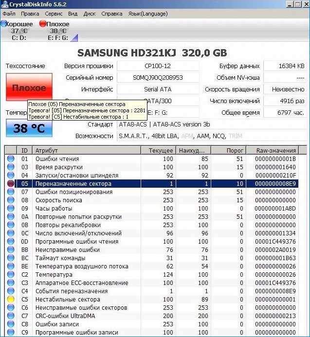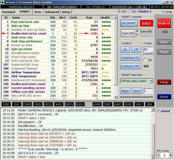 В итоге 1 день я ушел с экспериментами с программой Виктория из под ДОС, SMART вроде как статус выдавал диску "GOOD", дефектных 8 бед-блоков обнаруживал при тесте, ADVANCED REMAP вроде как сначала откорректировал их, затем при повторном проходе вновь штук 6 я обнаруживал причем по тем же адресам, но статус SMART для диска вроде "GOOD" остался.