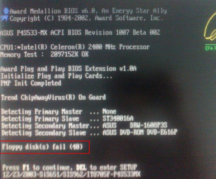 В этот момент БИОСом производится тест POST все устройства компьютера проверяются на работоспособность. У сканирование заканчивается ошибкой Floppy disk(s) Fail (40), данная ошибка возникает из-за некорректной работы Floppy disk (дисковода), либо от настроек в BIOS.
