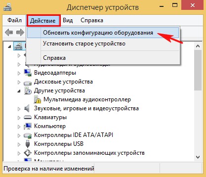 3. В Диспетчере устройств обновите конфигурацию оборудования