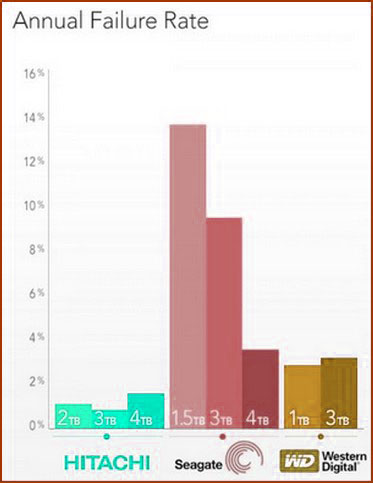 Но если верить статистики компании Backblaze (область резервного копирования) отражающую надёжность винчестеров различных производителей, то за последние четыре года у Seagate брака больше всех 13%, а у Hitachi около 3%, у Western Digital 5,2%.