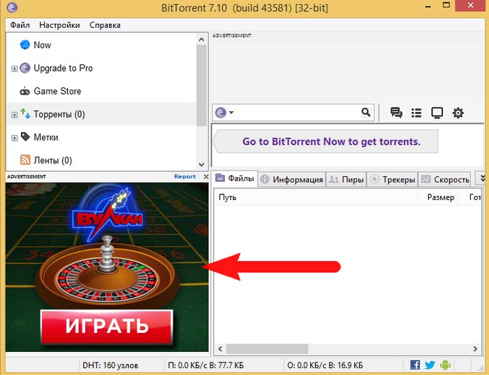 после этого автоматически запускается установленная на нашем компьютере программа - µTorrent и скачивает выбранный нами контент. Всё бы хорошо, но уже давно замечено, что µTorrent показывает в своём рабочем окне различную рекламу, чаще всего вредоносную. Опытные пользователи об этом знают и никогда не переходят по этой рекламе, а вот неопытные часто щёлкают на красивых картинках и устанавливают себе в систему различные нежелательные программы, в том числе и вирусы.