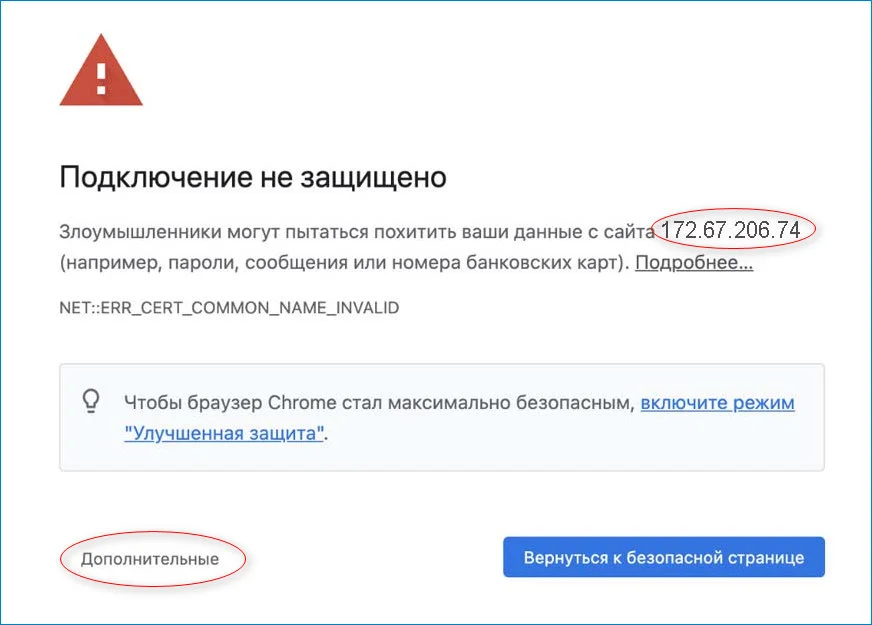 6. Есть и способ игнорировать проблему, который по сути является основным. Тут в окне с ошибкой нужно нажать "Дополнительные" и выбрать "Перейти на сайт". На таком сайте мы не рекомендуем вводить свои пароли, номера карт и другие данные.