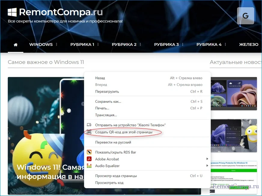 Открываете любой сайт, правый клик мыши и выбираем "Создать QR-код для этой страницы".