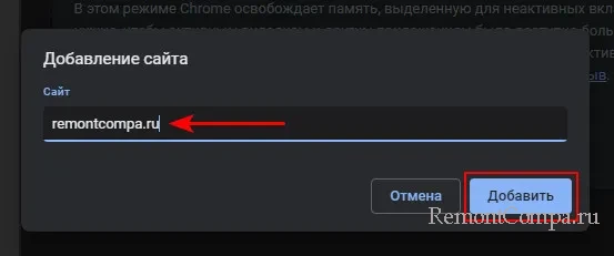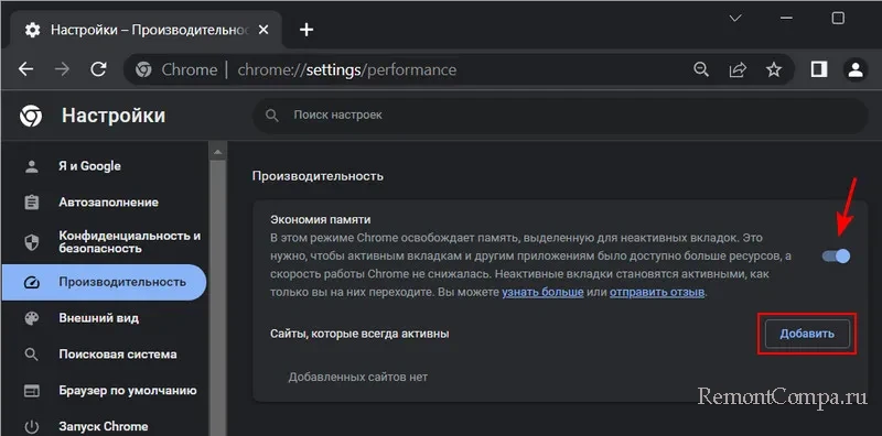 Друзья, если у вас компьютер с малым объёмом оперативной памяти можете попробовать компромисс – оставьте экономию памяти включённой, но настройте сайты-исключения, для которых эта функция не будет применяться, и их вкладки будут всегда активны. Для настройки сайтов-исключений жмём «Добавить».