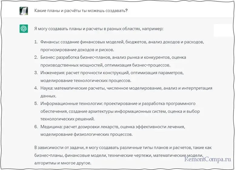ChatGPT может также многие прочие вещи, о которых он охотно расскажет сам, если у него спросить, уточнив сферу интересов.