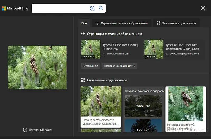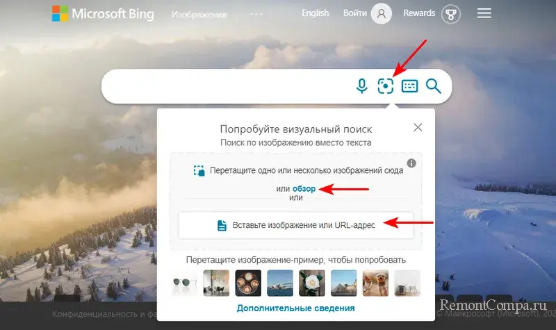 Визуальный поиск Bing встроен в поисковик Bing от компании Microsoft. Здесь также можем использовать для поиска изображение из файла или буфера, либо указать его ссылку.