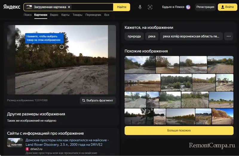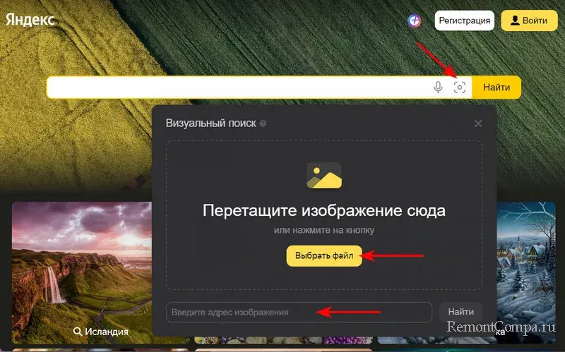 Поисковик Яндекс также имеет интеграцию визуального поиска - поиск по картинкам.