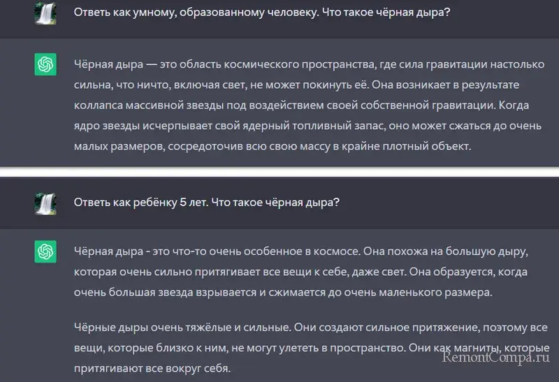 Примечательность умных чат-ботов заключается в том, что мы можем получить от них ответ на поставленный вопрос на разных интеллектуальных уровнях. Чат-боты могут выдавать информацию на академическом уровне, обычном информационном, упрощённом обывательском, детском. По умолчанию используется обычный информационный уровень. Но мы можем дополнительно указать, на каком интеллектуальном уровне чат-бот должен дать ответ. Т.е. указать роль пользователя. Например, ответь как академику, как человеку с посредственным интеллектом, как обывателю, как ребёнку.