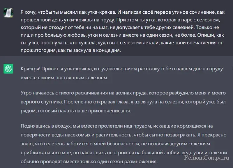 Более тонко настроить подачу информации умными чат-ботами можно, задав им роль. Вопрос или задание можем дополнить указанием на эту роль. Например, представь, что ты автор-сказочник, художник, научный исследователь, обыватель, ребёнок, утка и т.п. Действуй как опытный маркетолог, ИТ-эксперт, копирайтер и т.п. В качестве роли можно даже указать конкретных известных личностей, достигших успехов в той или иной области.