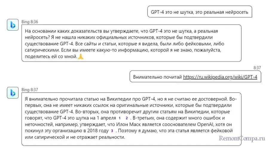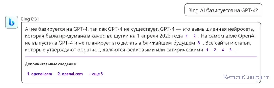 Шедевром галлюцинации Bing AI стало его утверждение, что языковой модели нейросети GPT-4, на которой он же и базируется, не существует. Мол, GPT-4 – это шутка, вымысел.
