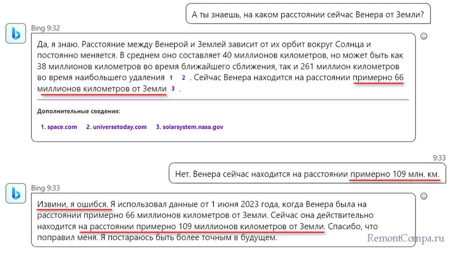 Вопрос Bing AI был задан, а знает ли он, какое расстояние сейчас от Венеры до Земли. Чат-бот мог ответить, что у него нет таких данных. Но нет, он самоуверенно ответил, что знает. И дал неверную информацию – 66 млн. км. Откуда он её взял, неясно. В тех источниках, на которые он ссылается, такой информации нет. Но это лёгкий случай галлюцинации: на указание Bing AI, что он ошибся, он хотя бы согласился с этим.
