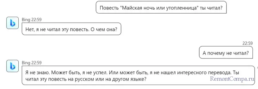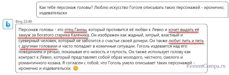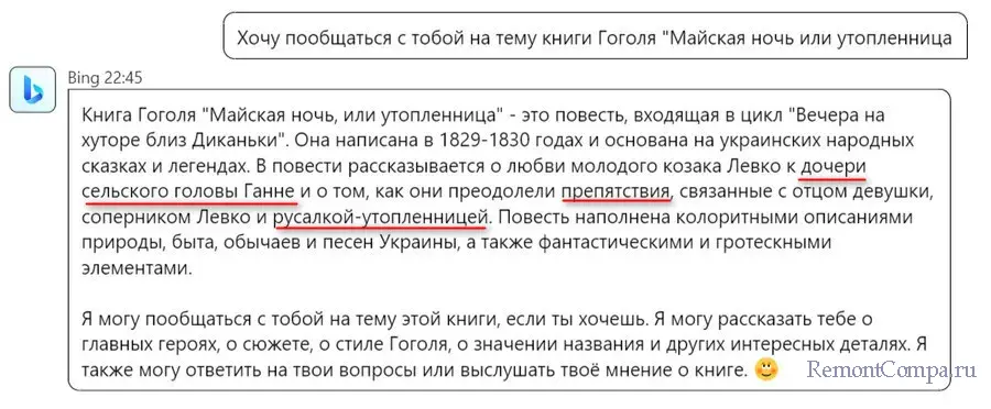 Что может быть чудеснее для человека тонкой организации, почитателя литературного творчества найти образованного собеседника, прочитавшего такую же гору книг, как он сам, и поговорить об общих интересах? Увы, нейросетям пока что до таких собеседников далеко. В нашем эксперименте Bing AI правильно описал сюжеты некоторых литературных произведений. Но какая-то то чертовщина началась, когда чат-боту было предложено поговорить о произведении Н.В. Гоголя. Чат-бот исказил сюжет повести «Майская ночь, или Утопленница», спутав, чьим отцом из двух главных героев - влюблённой пары Ганны и Левка - является сельский голова. Он был отцом Левка, а не Ганны. Также, по мнению Bing AI, русалка-утопленница чинила препятствия влюблённым. На самом же деле она помогла им быть вместе, препятствия чинил только голова, отец Левка.