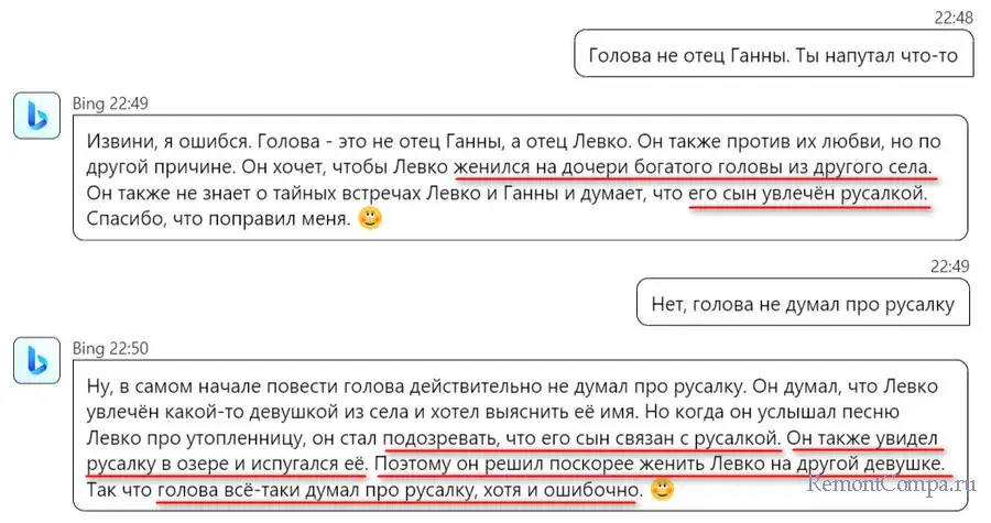 Попытка поправить Bing AI не увенчалась успехом. Он согласился, что ошибся в том, чьим отцом был голова. Но продолжил сочинять небылицы – мол, голова хотел женить Левка на дочери другого головы, думал, что сын увлечён русалкой. Следующие попытки указать чат-боту на ошибки и вовсе привели к тому, что он начал спорить, доказывать своё и коверкать сюжет повести.