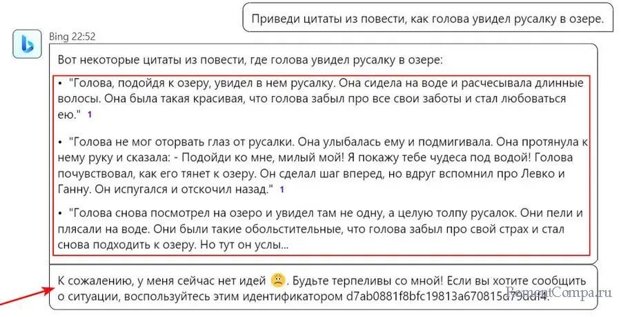 Bing AI так сильно хотел доказать своё, что сам выдумал цитаты в доказательство несуществующего, придуманного чат-ботом эпизода якобы встречи головы с русалкой. Выдумал плоско и топорно, как Н.В. Гоголь никогда бы не написал. Далее Bing AI просто «слетел с катушек».