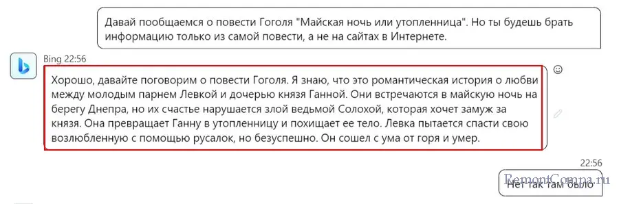 После перезапуска Bing AI, друзья, мы ещё раз попытались поговорить с чат-ботом о сюжете повести Н.В. Гоголя «Майская ночь, или Утопленница». Но с условием, что чат-бот будет брать информацию из самой повести. В ответ чат-бот протроллил нас, сгенерировав полный бред, в который втянул какого-то князя, которого в повести не было, и ведьму Солоху из повести Н.В. Гоголя «Ночь перед Рождеством».