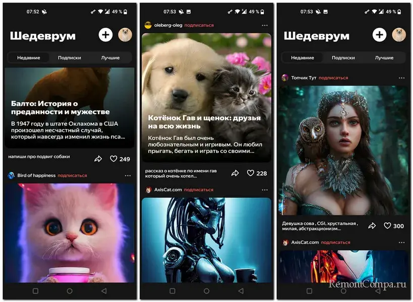 Приложение «Шедеврум» - это не просто сервис генерации контента с помощью нейросетей, как многие другие. Это приложение создано по типу социальной сети. Все сгенерированные его пользователями тексты и изображения вместе с заданиями, по которым они сгенерированы, доступны другим пользователям. Сгенерированные тексты и изображения – это посты. Ими можно делиться, можно им ставить лайки.