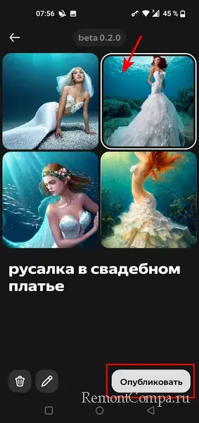 Нейросеть предлагает на выбор 4 варианта картинки. Выбираем нужный вариант, жмём «Опубликовать».