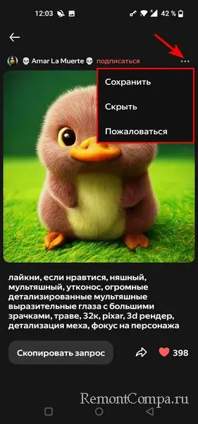Любые сгенерированные картинки – свои или других пользователей – можем сохранить на мобильное устройство. В числе опций меню каждой картинки в общей ленте, подписках или нашем профиле есть опция «Сохранить». Но таким образом картинка сохранится в небольшом размере 698х698 пикселей.