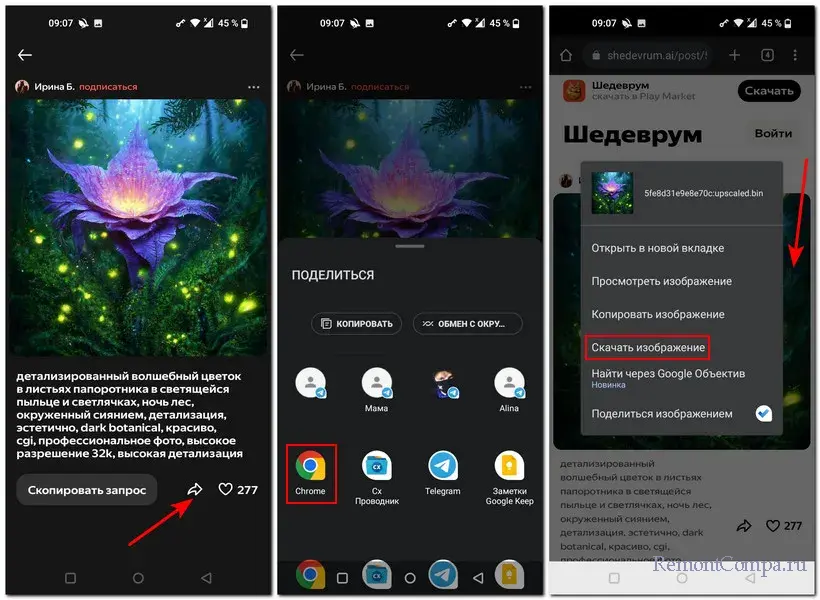 Для сохранения картинки в размере 1024х1024 пикселей жмём для неё кнопку «Поделиться». Выбираем мобильный браузер. Пост из приложения «Шедеврум» откроется в окне браузера. Делаем долгий тап на картинке и в появившемся контекстном меню выбираем скачивание изображения.