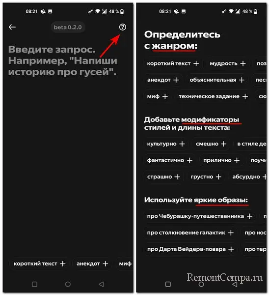 Нужно написать задание по генерации текста, и чтобы помочь нам в этом деле, Яндекс предусмотрел подсказки. Можем нажать кнопку с вопросительным значком, нам откроются перечни ключевых слов для указания жанра текста, слова-модификаторы стиля текста, описания образов.