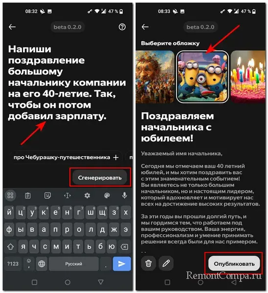 Описываем задание для генерации текста. Жмём «Сгенерировать». Далее приложение предложит несколько вариантов обложки, т.е. картинки под этот текст, чтобы это был пост. Выбираем обложку. Можем подредактировать текст. И в итоге нажимаем «Опубликовать».