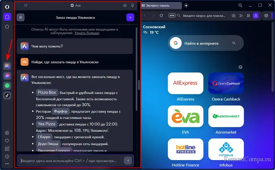 Чат с Aria доступен на боковой панели браузера в числе веб-приложений соцсервисов.