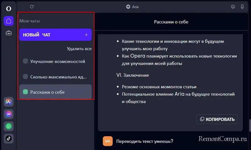 Реализация Aria схожа с реализацией ChatGPT: можем общаться с чат-ботом в разных чатах на разные темы, удалять ненужные, оставлять нужные; чаты получают название автоматически, исходя из контекста разговора. Наши чаты с Aria хранятся в течение 30 дней.