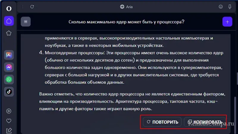 Для каждого ответа Aria предлагается кнопка копирования этого ответа. И есть кнопка повторения нашего запроса на случай, если Aria в процессе генерации потерпит сбой.