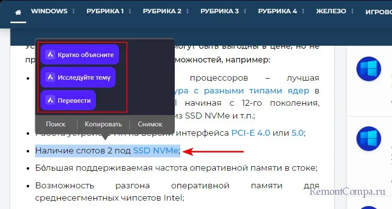 Есть у Aria и уникальная возможность. Из числа всех интегрированных в браузер умных чат-ботов Aria оригинален, собственно, интеграцией в браузер. Он может кратко объяснять термины или темы и выполнять перевод выделенного в браузере текста. На веб-странице выделяем интересуемый нас текст. После этого автоматически появляется меню, в котором в числе прочих браузерных операций видим операции Aria – краткое объяснение, исследование темы, перевод.