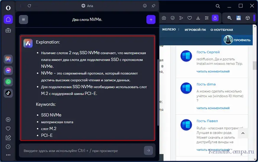 Что же касается конкретно Aria, здесь можно отметить в целом реализацию идеи браузерного ассистента, который, пусть не по каждому вопросу, но по многим, может за нас, людей выполнять задачи по поиску и анализу информации. Можно отметить эффективность Aria в поиске информации, поскольку чат-бот работает, в частности, с поисковиком Google. Но в целом Aria проигрывает Microsoft Edge и его Bing AI: последний более функциональный, более качественный, более развитый. Плюс к этому, на данный момент реализация Aria ещё сырая, чат-бот постоянно сбоит.