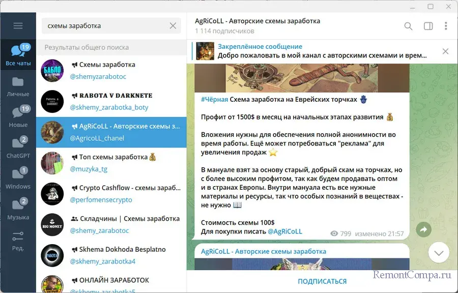Темщики – изначально это мошенники, спекулянты, торговцы краденым. Позднее темщиками стали называть людей, пытающихся разбогатеть быстро и легко, часто при этом живущих в долгах. Один из способов заработка темщиков – продажа самих схем заработка. В поиск Telegram вбиваем запрос типа «схемы заработка» и видим несколько каналов, предлагающих схемы заработка.