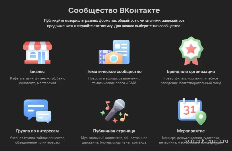 Во всех случаях, кроме аудио и мини-приложений, для заработка потребуется создать сообщество ВКонтакте. Это общий термин, который включает разные типы пабликов разных форматов:
